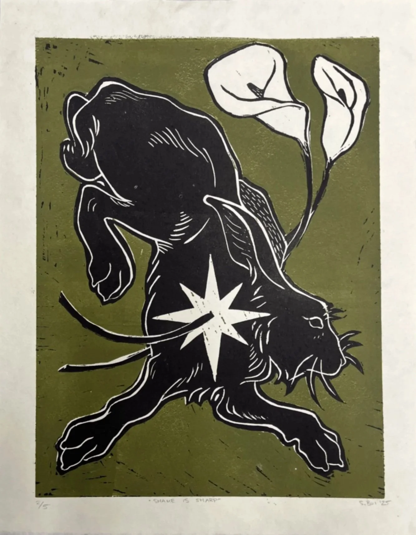 "SHAME IS SHARP" 3/5, 2025, Linoleum Relief on Paper, 11" x 14".